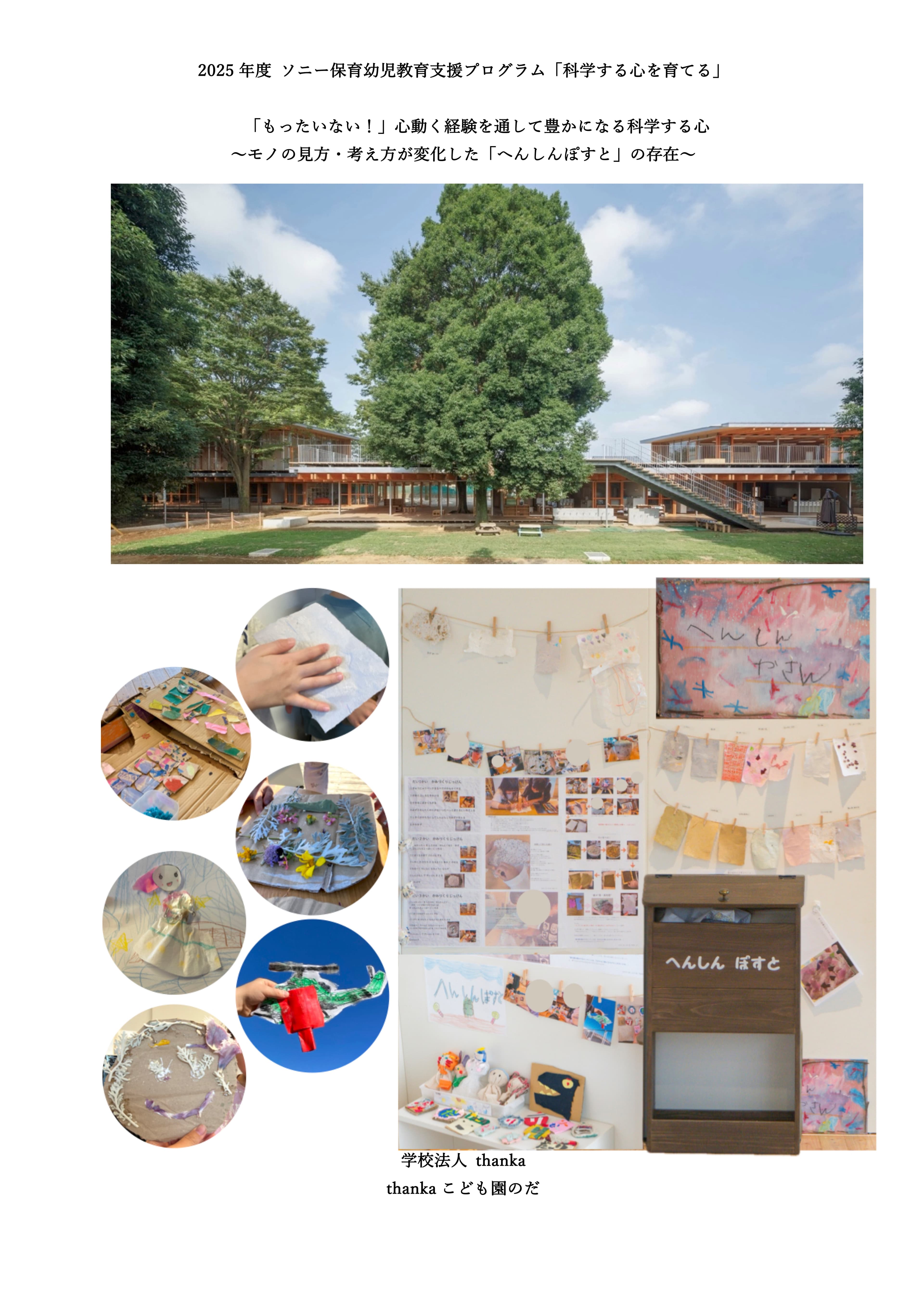 thankaこども園のだは『「もったいない!」⼼動く経験を通して豊かになる科学する⼼ 〜モノの⾒⽅・考え⽅が変化した「へんしんぽすと」の存在〜』というテーマで応募し、奨励園に選出されました。